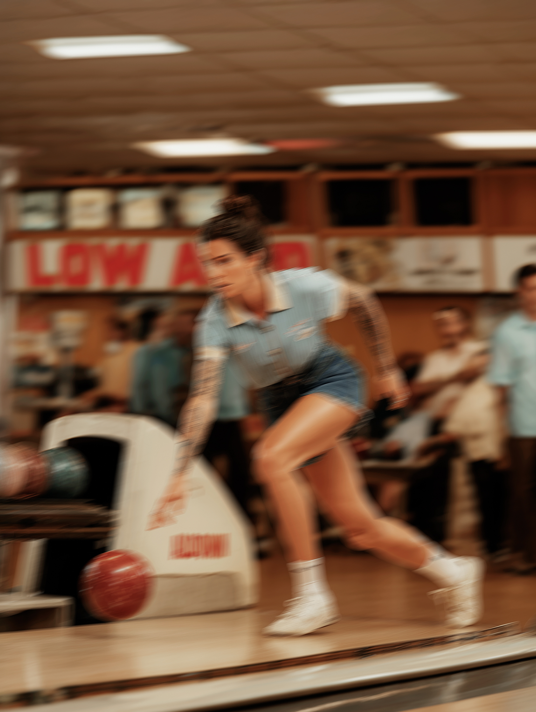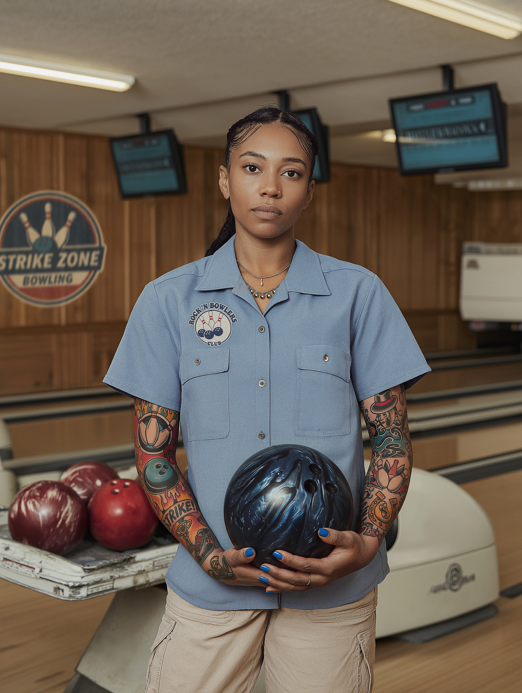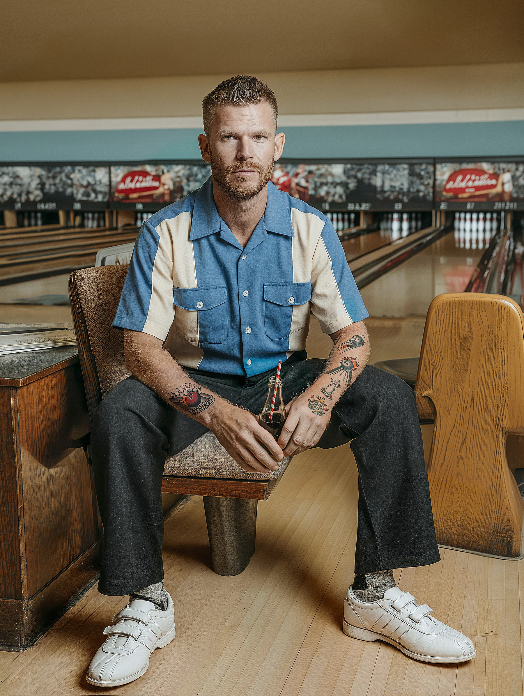 TEN PIN ALLEY is a portrait series that explores ideas of constructed reality, identity and collective memory. The project focuses on bowlers from small American towns. Set against the backdrop of neon lights, worn lanes and aging interiors, the series portrays local heroes for whom sport, identity and lifestyle are deeply intertwined. For these men and women bowling is more than a recreational activity. It is part of a way of life shaped by routine, dedication and shared values. At the same time, Ten Pin Alley presents a world in which fact and fiction merge. The characters and situations are artificial, yet constructed with a strong sense of authenticity. The posture and appearance of the players, their bowling shirts with club patches, tattoos and personal markers, as well as their surroundings, contribute to a familiar and almost archetypal visual language we collectivly remember from film and television.